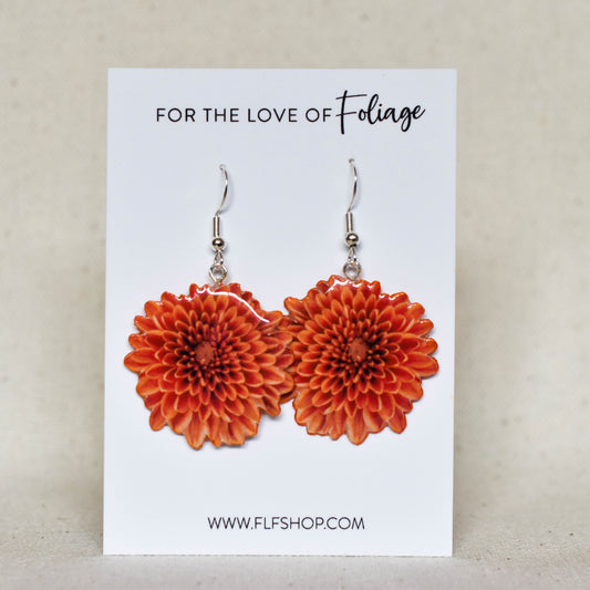 Orange Chrysanthemum "Mums" Blossom Earrings | Leaf Earrings
