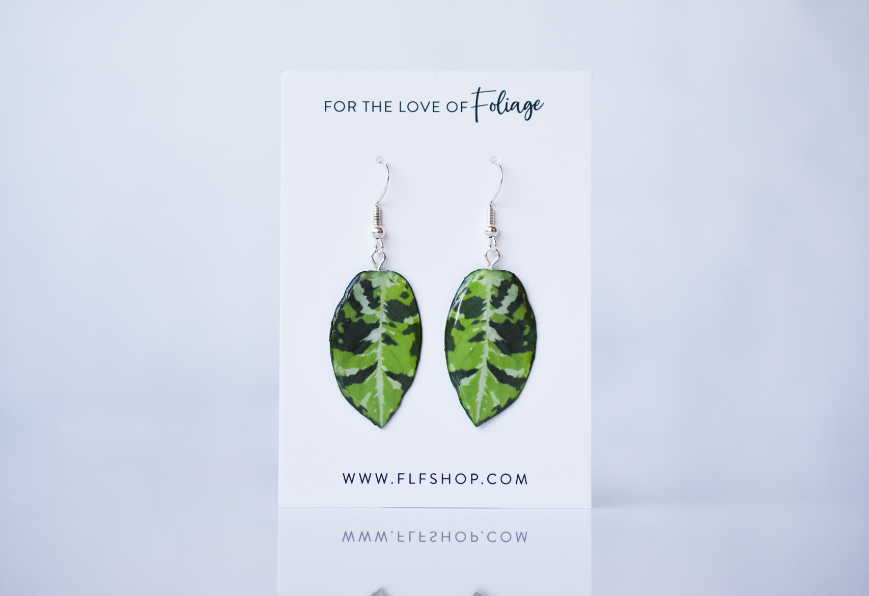Add some green to your wardrobe with these handmade Aglaonema Pictum Tricolor Plant Earrings!
