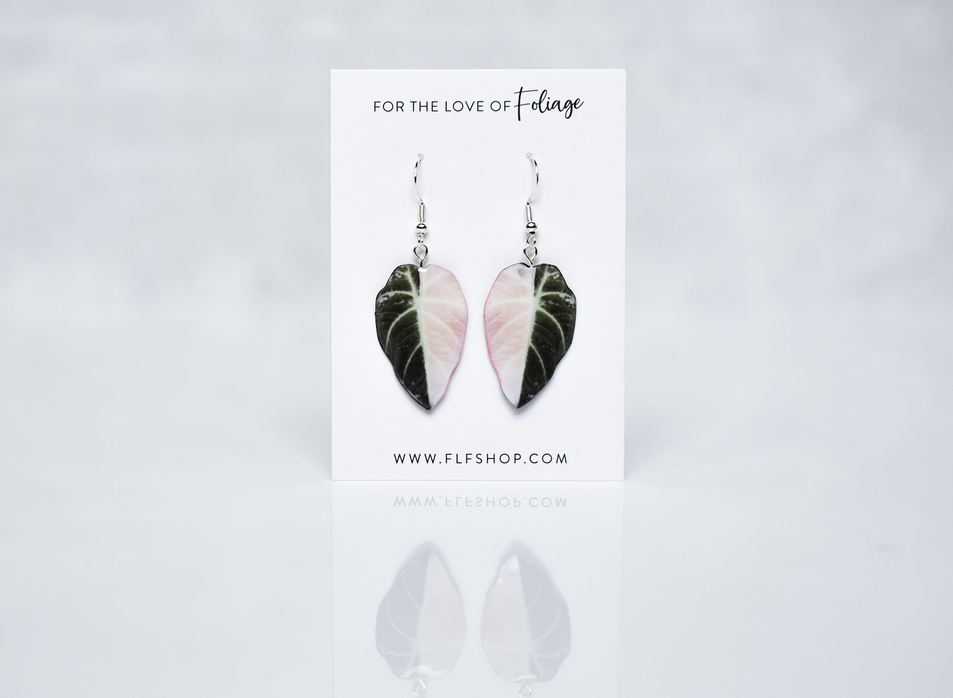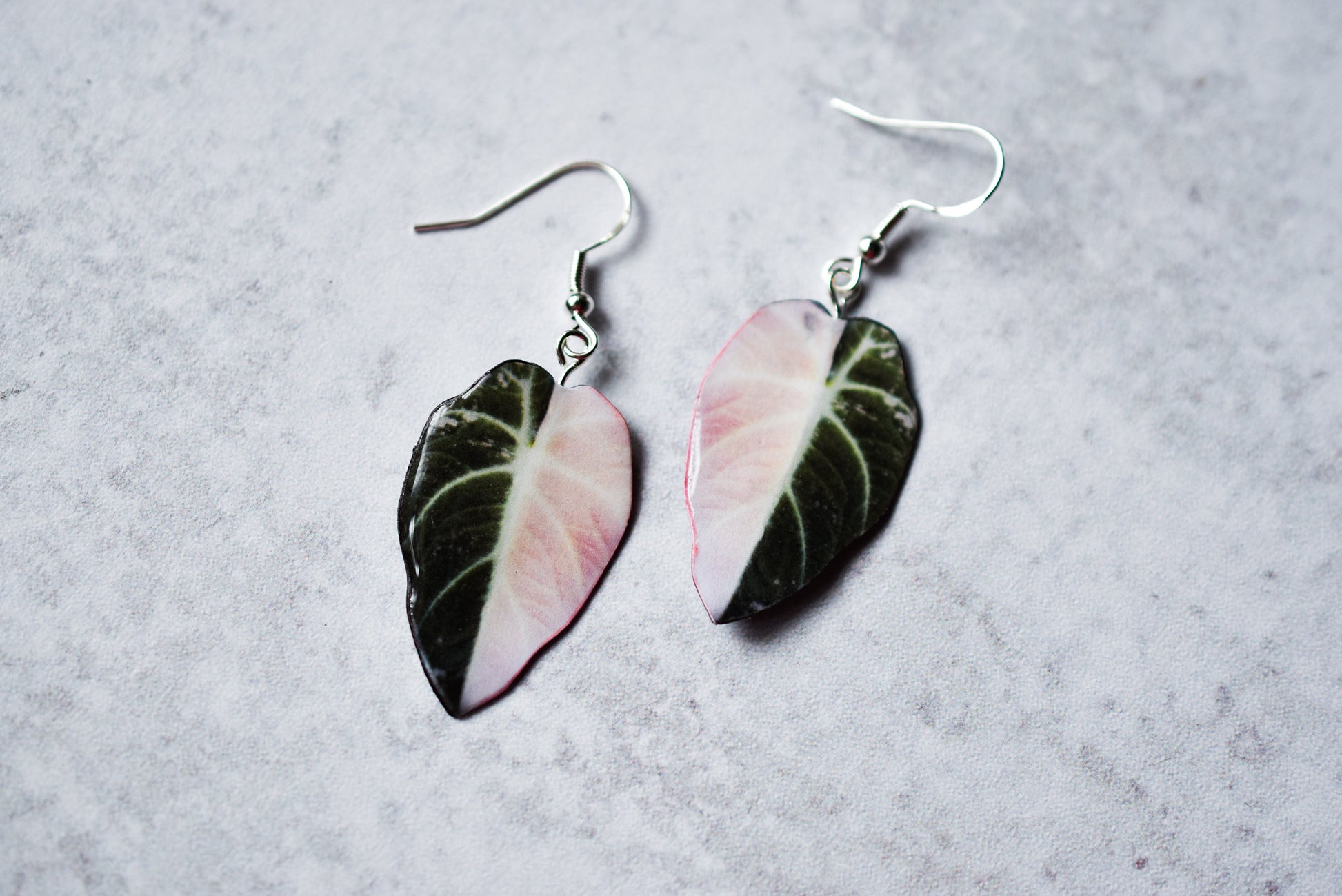 Handmade in Cleveland, Ohio out of paper and resin, these earrings feature hypoallergenic sterling silver hooks and are light as a feather. They are a perfect gift for any rare plant lover, capturing the texture of this rare plant leaf and giving off the slightest pink hues without being too bold.