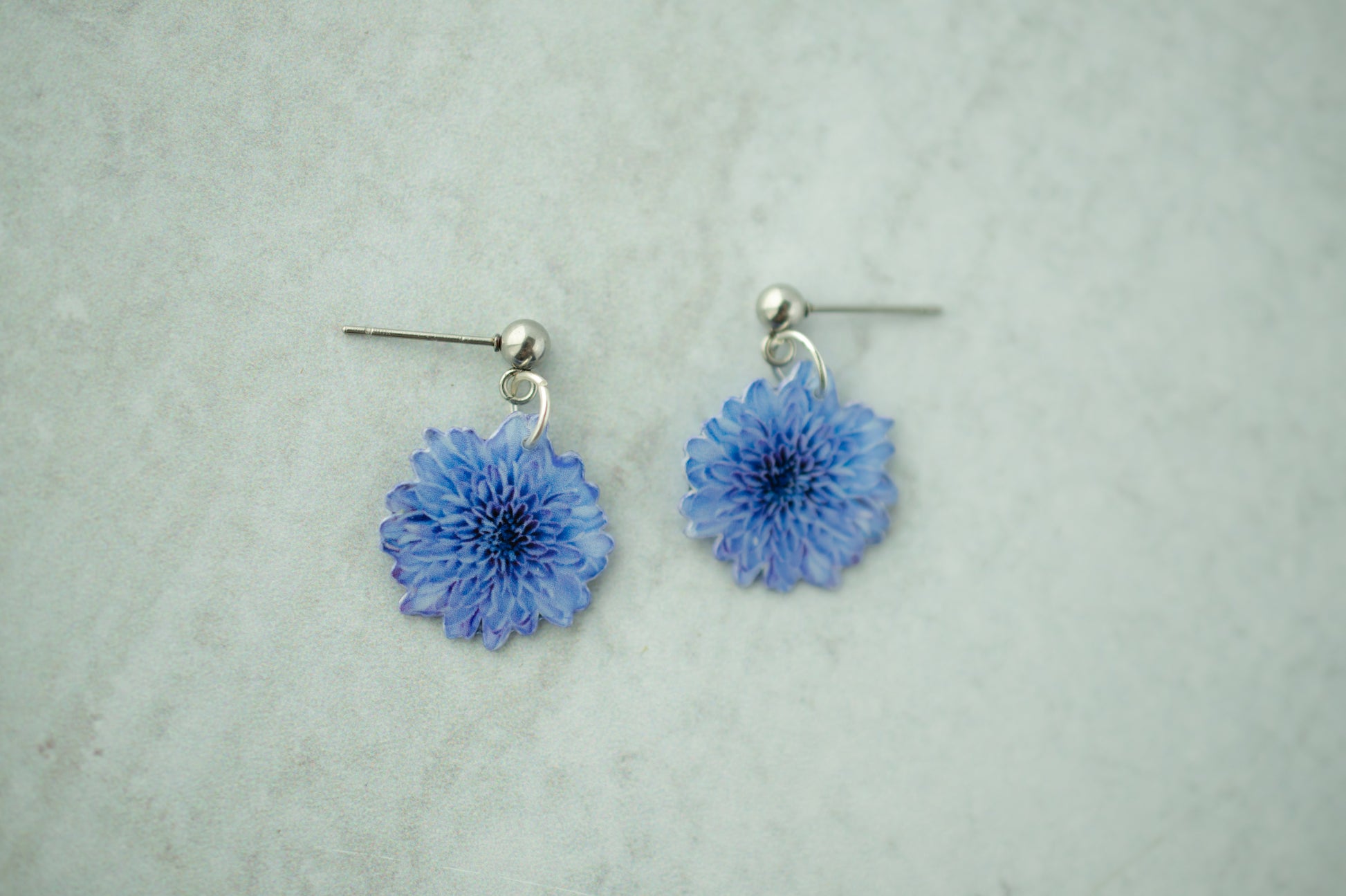 Handcrafted in Cleveland, these earrings feature striking blue chrysanthemum blossoms made from paper and resin.