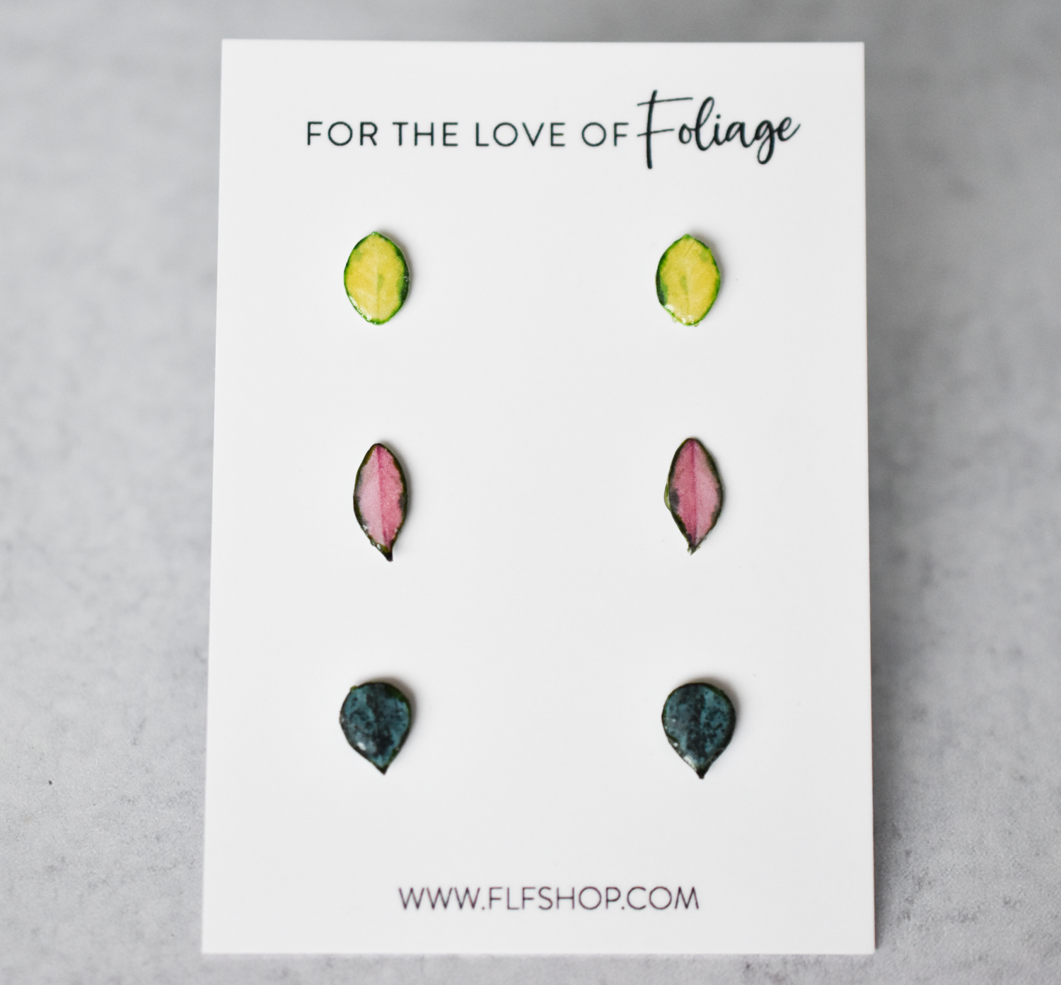 Features 3 adorably tiny handmade leaf studs: Krimson Princess, Australis Lisa and Krohniana Silver!