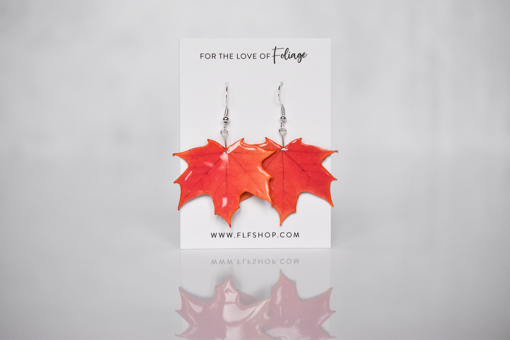 Let your style show some fall vibes with these unique Orange Maple Leaf Plant Earrings.